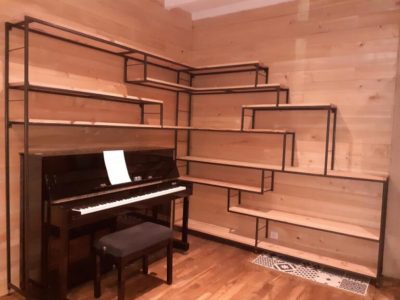 Banc en acier vernis pour une utilisation en extérieur avec une assise en douglas finition cire d’abeille. Pièce unique pour un cadeau de noces de...